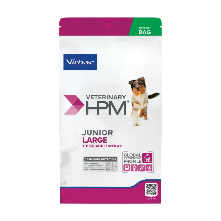 Virbac VETERINARY HPM® Junior Large Dog, yetişkin ağırlığı 25 kg üzeri olacak büyük ırk köpekler için geliştirilmiş tam ve dengeli bir kuru köpek mamasıdır. Bu özel formül, 8–18 aylık genç köpeklerin büyümenin son aşamasındaki ihtiyaçlarını karşılamak üzere tasarlanmıştır.